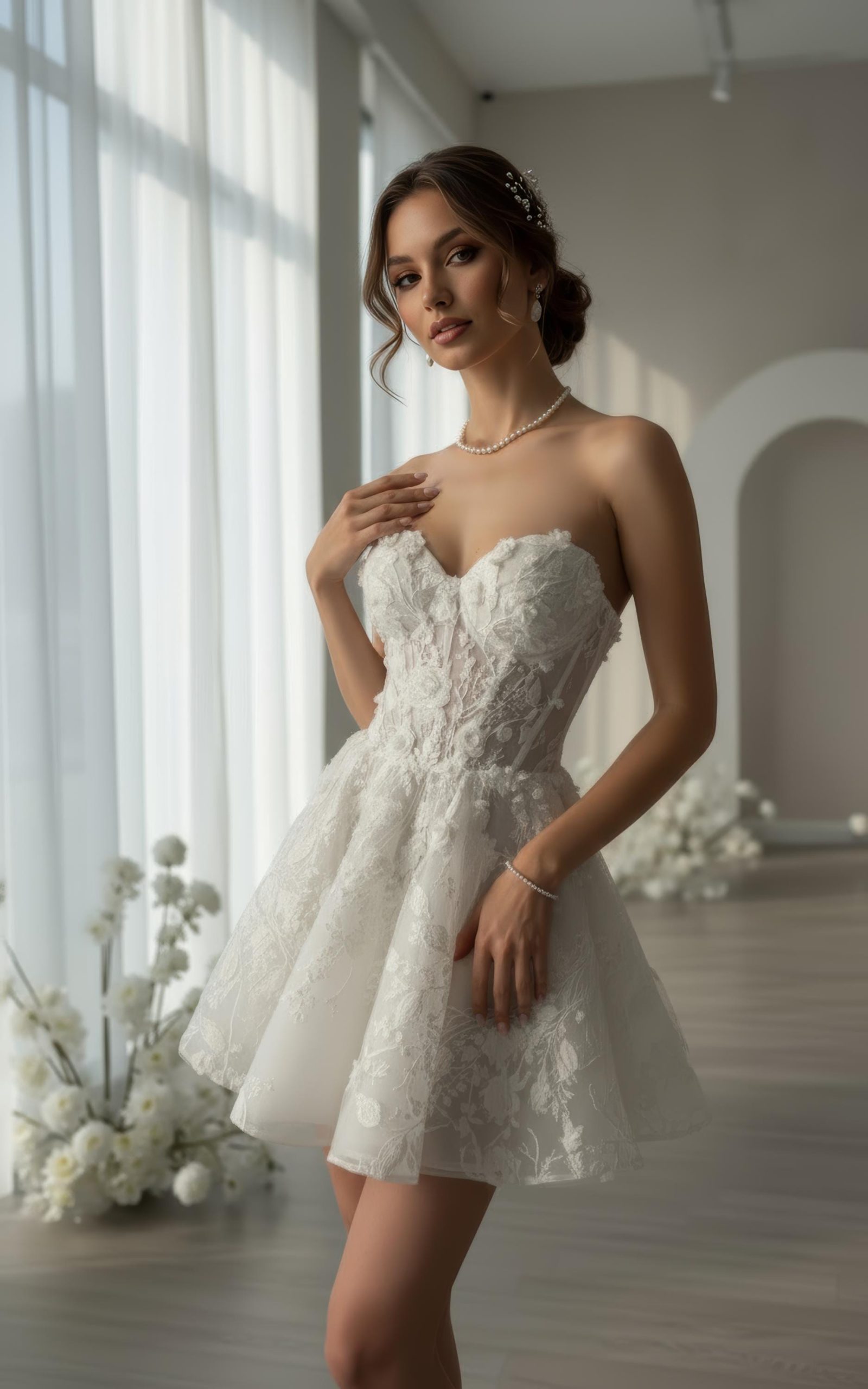 Make your moment unforgettable in this short floral lace corset wedding dress, crafted for the modern romantic bride.